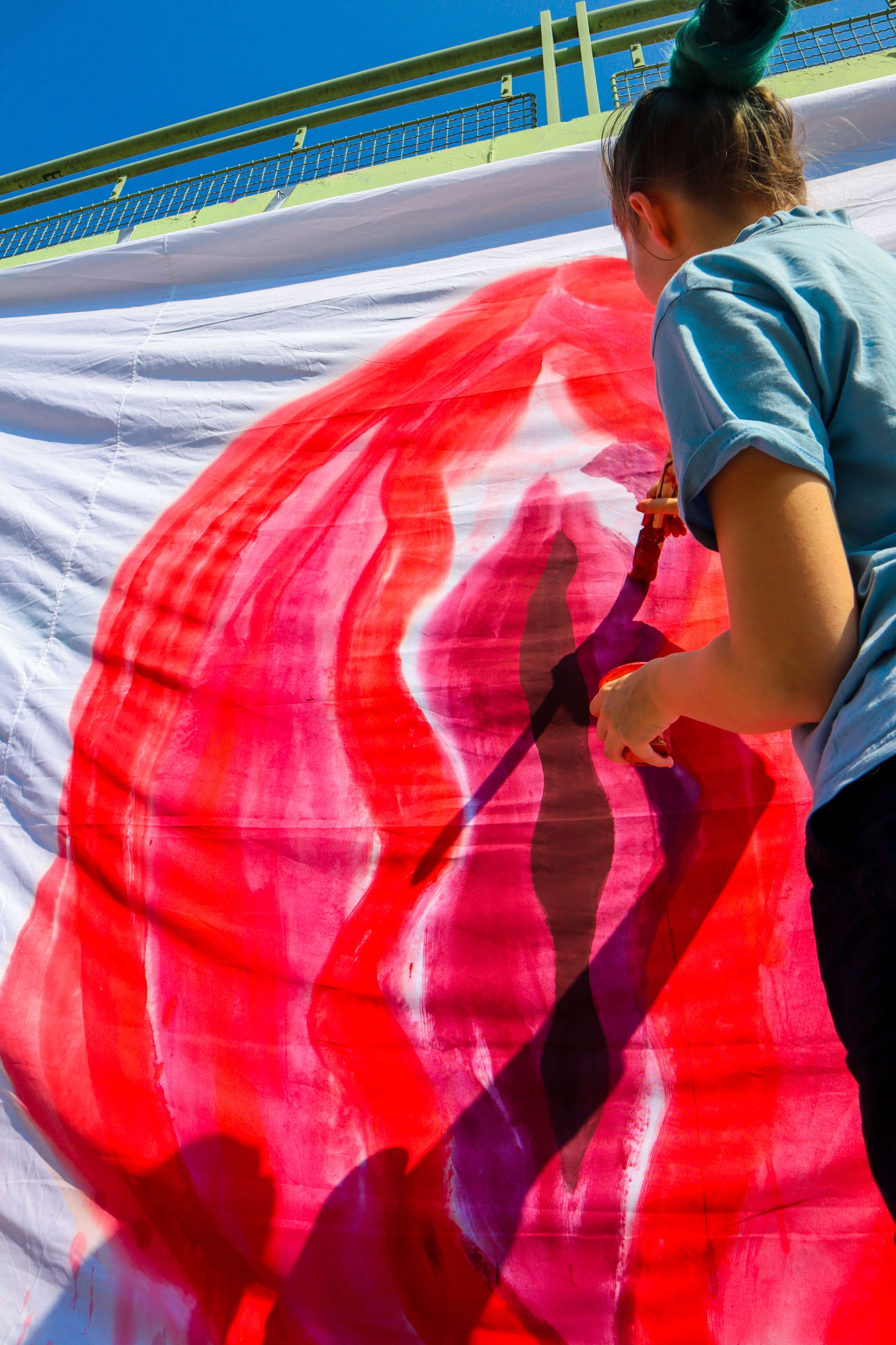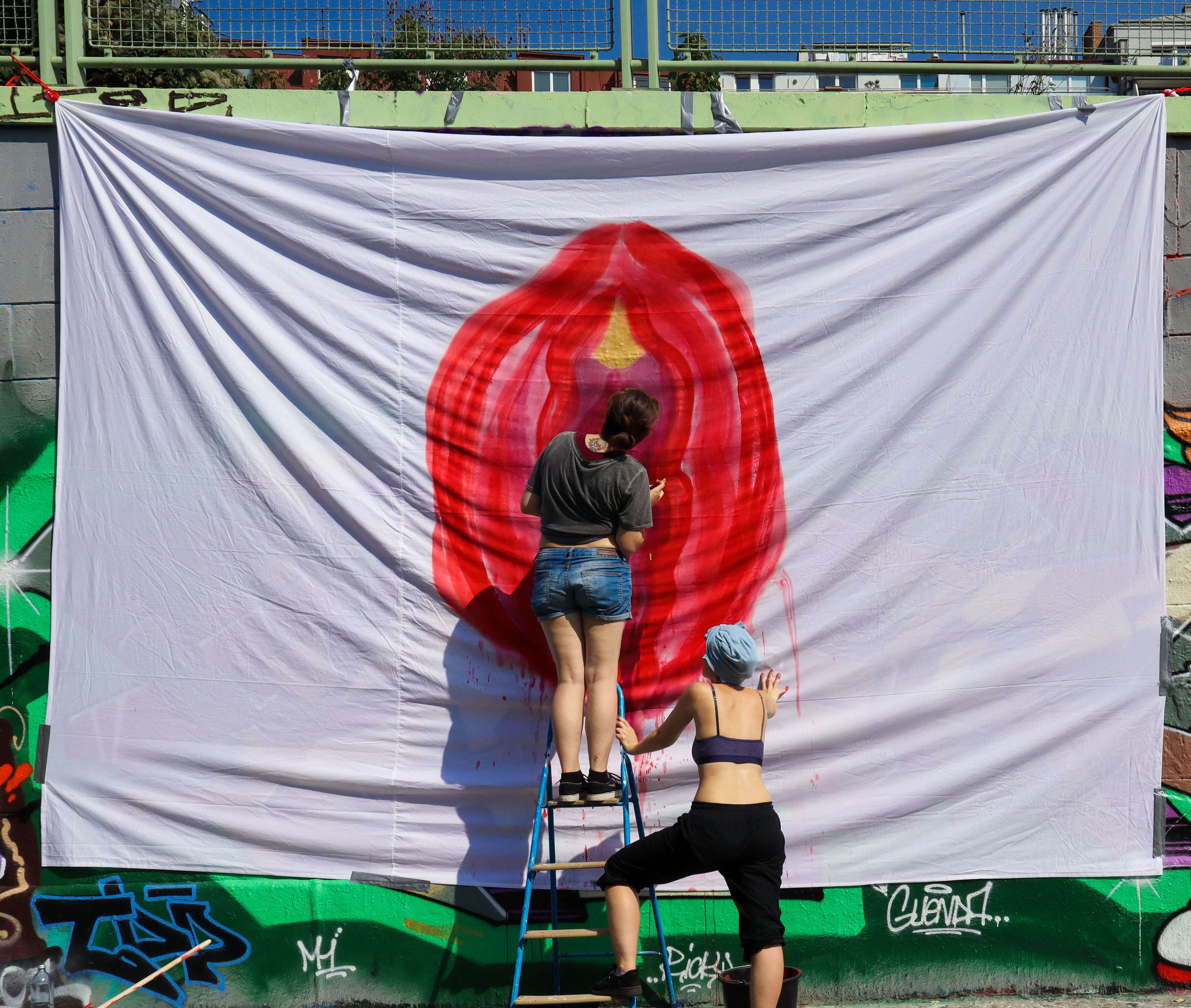 Wir versehen Binden mit Sprüchen, die zum Beispiel das Thema Menstruation mit einem simplen „Ich habe meine Tage!“ zusammenfassen, verkleben kleine Zettel mit Skizzen und bemalen und bekleben großflächig Wände (an legalen Orten versteht sich! :P).