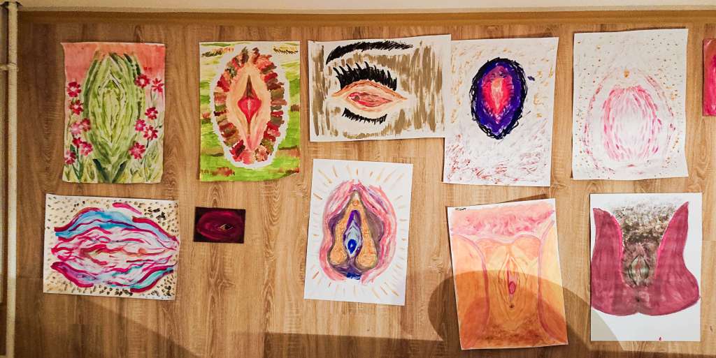 2020 hielten wir einen Workshop für die Darsteller*innen der Vagina Monologe. Es entstanden wundervolle Acryl- und Wasserfarben-Vulven, die für das Bühnenbild verwendet wurden. Wir stellten unseren Werke in einem Extra-Raum sowie im Veranstaltungssaal im Theater Spektakel aus.